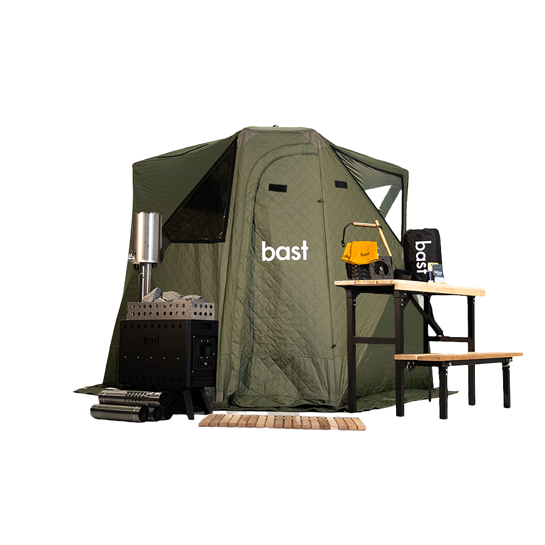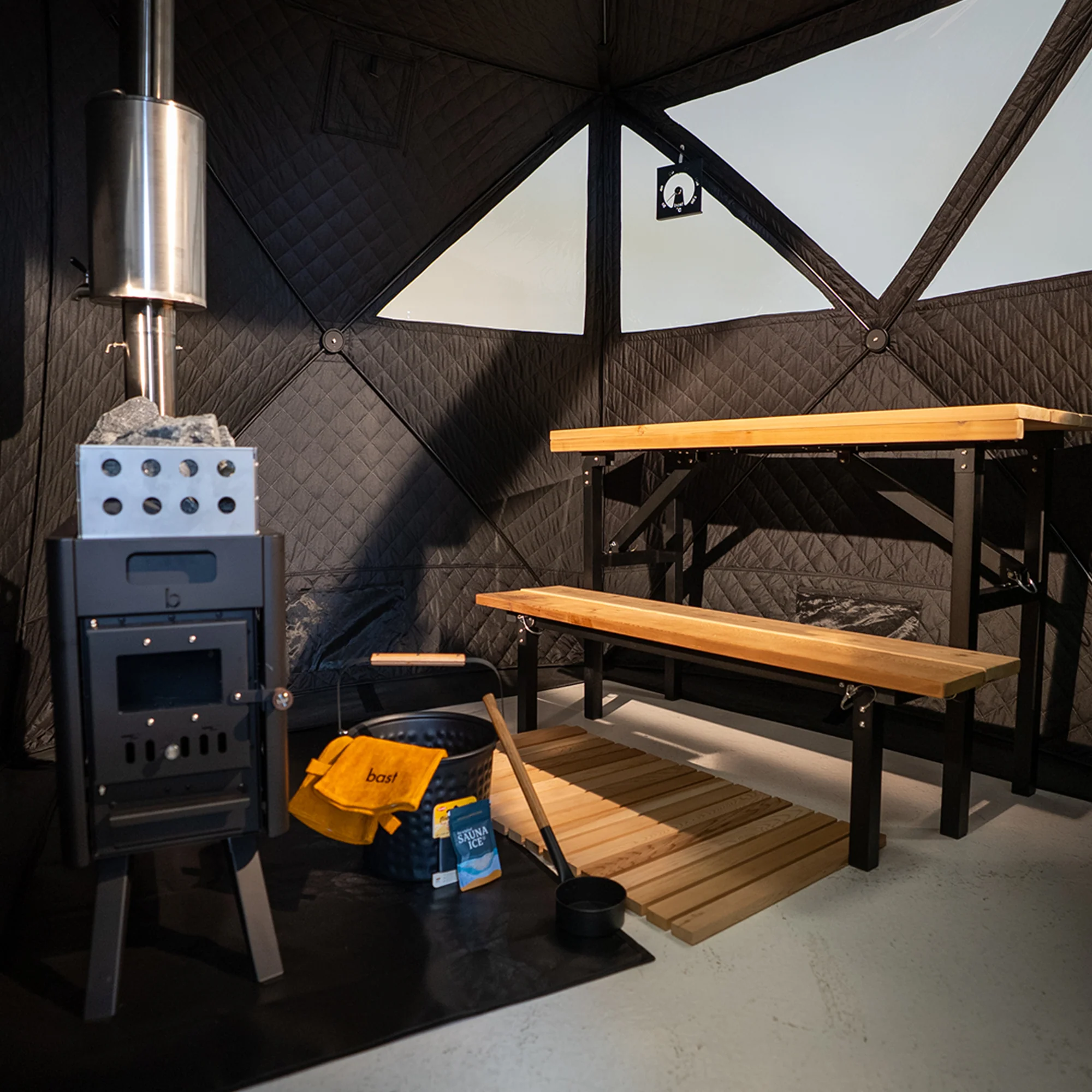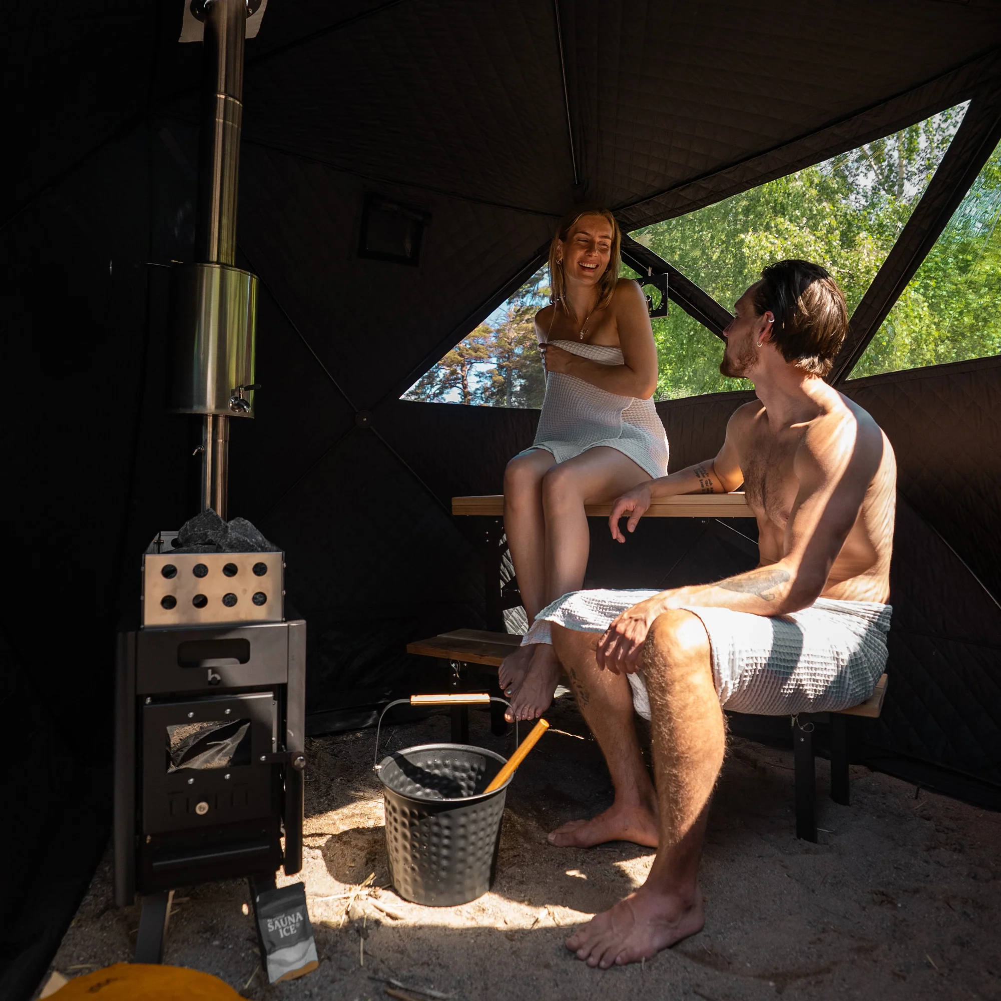 Our sauna tents are designed to deliver a true sauna experience — without compromise. With a pop-up function, the tent assembles in just a few minutes and can easily be done by one person. Our powerful stove is made from the market’s thickest, high-quality stainless steel to ensure long-lasting durability while producing heat of up to 100°C, no matter the climate. A flexible sauna that requires no building permit and fits in the trunk of your car — yet delivers the same performance as a traditional sauna.